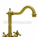 Назначение: кухонный • Конструкция: двухрычажный • Монтаж: горизонтальный • Клапан: керамический • Материал: латунь, покрытие - золото • Подводка: гибкая • Монтажные отверстия: 1 отверстие • Форма излива: традиционная • Душевая лейка в комплекте: нет • Аэратор: есть